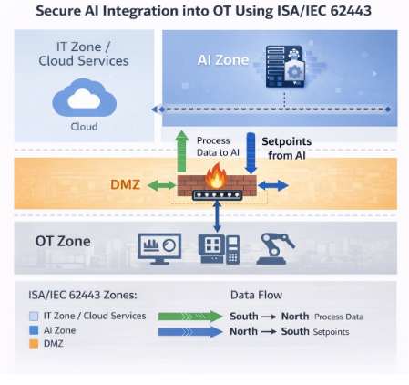 • South → North: Process data flowing from ICS to AI for analytics and optimization